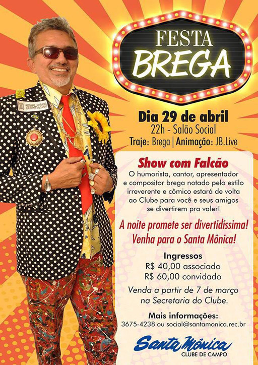 A noite de 29 de abril está reservada para a celebração do brega. Os convidados devem ir preferencialmente fantasiados em trajes ‘não chiques’. E quem melhor para fazer a harmonização sonora que o mestre supremo do brega? Sim, o cantor e comediante Falcão chega a Colombo, na Região Metropolitana de Curitiba, para apresentação no Santa Mônica Clube de Campo.