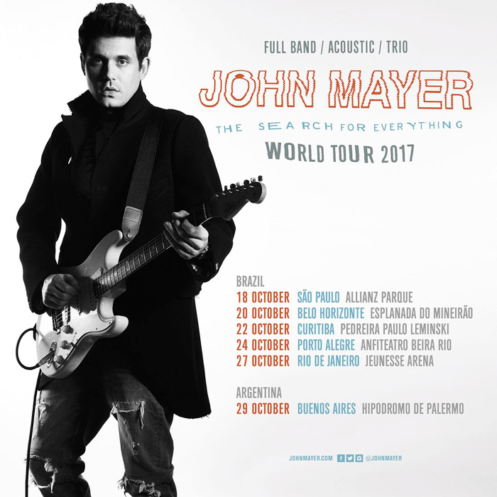 Ele vem ao país com a turnê do álbum The Search for Everything – o 12º de sua trajetória – e mostrará sons de toda sua careira com a John Mayer Trio; também haverá espaço para uma parte acústica. O show é uma realização RW 7 Production & Entertainment, LivePass e Move Concerts.