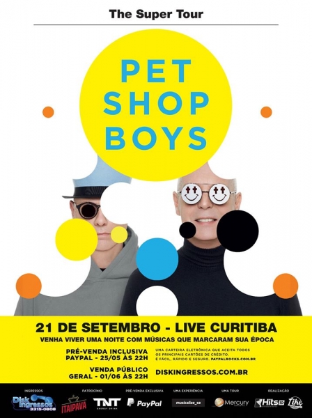 O Pet Shop Boys está no Brasil pela 7ª vez. Entretanto, será a primeira oportunidade que o duo Chris Lowe e Neil Tennant subirá aos palcos curitibanos. Eles vão se apresentar nesta quinta (21) na Live Curitiba, a partir das 22 horas. Eles fizeram antes um marcante show no Rock in Rio (antes de serem assaltados), e também já passaram por São Paulo e Brasília, onde tocaram um extenso repertório, confira mais abaixo a lista de músicas. Porto Alegre também está na rota.