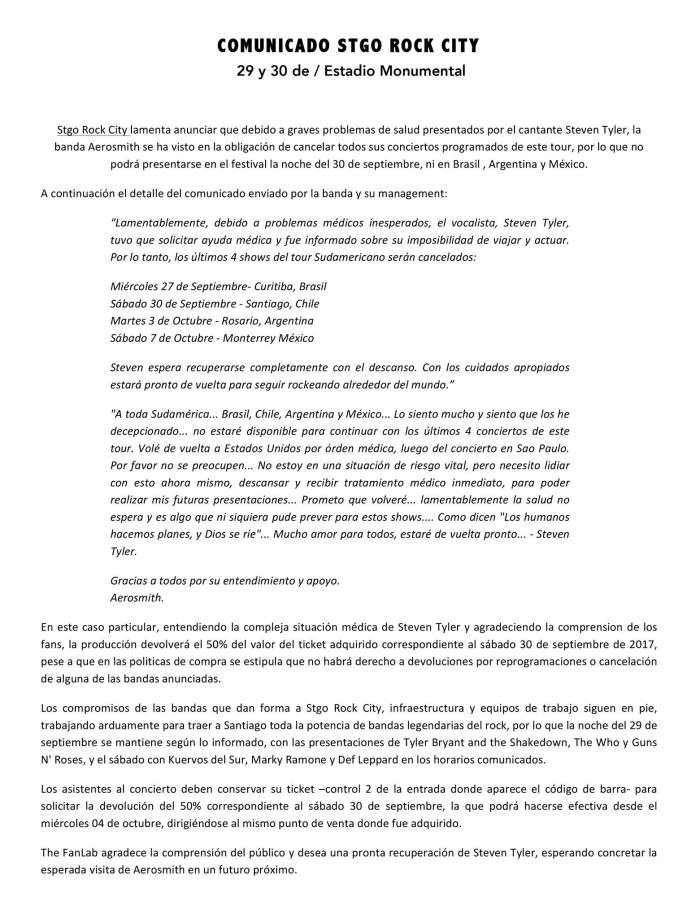 A informação do cancelamento veio da Stgo Rock City (responsável pelo show da banda no Chile), que informou que os próximos 4 shows da banda não vão mais rolar. Argentina e México também foram afetados, além do Brasil e Chile. A produção em Curitiba confirmou o cancelamento. Veja abaixo a nota publicada pela produtora chilena.
