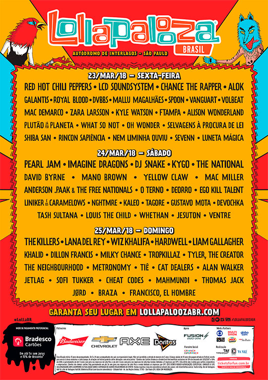 O Lollapalooza divulgou oficialmente quais bandas tocam em quais dias na edição de 2018 do festival. Os ingressos para apenas uma data também já estão disponíveis. Antes, era possível apenas comprar o pacote completo para os três dias. O festival vai rolar entre os dias 23 e 25 de março de 2018, no Autódromo de Interlagos, em São Paulo.
