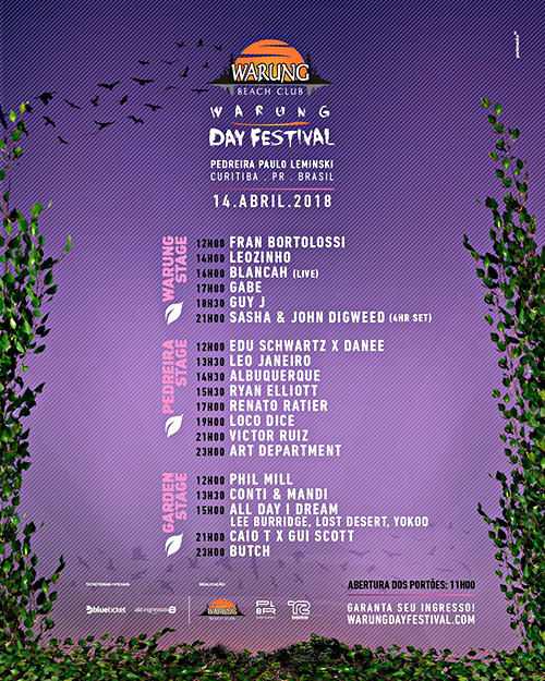 A organização do Warung Day Festival, evento de música eletrônica, anunciou os horários das atrações que trará dia 14 de abril. A festa reunirá grandes nomes da cena eletrônica mundial, e a tão esperada apresentação de 04 horas das lendas Sasha & John Digweed.