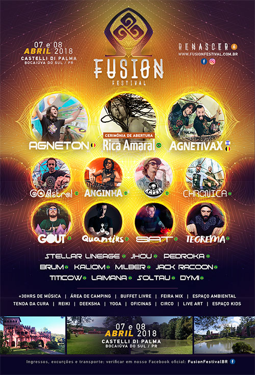 Devido ao sucesso em suas últimas edições, Curitiba recebe nos próximos dias 7 e 8 de abril o Fusion Festival Renascer, que acontecerá no Castelli Di Palma. O evento que, desde 2010 atrai os amantes do ritmo eletrônico, volta com aproximadamente trinta horas de música e a apresentação de dois projetos internacionais: Agneton (Bélgica) e Agnetivax (Israel e Bélgica).