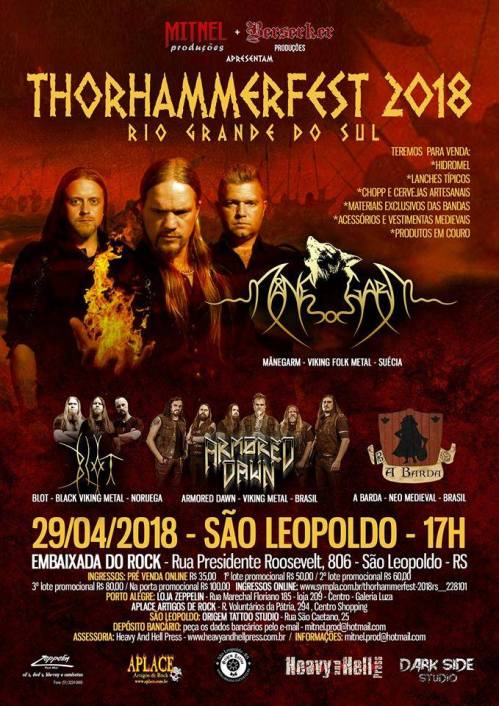 Integrando o line-up de peso, teremos como headliners os suecos da consagrada Månegarm, uma das lendas do Viking/Folk Metal mundial, e também os noruegueses do Blot (Black/Viking Metal), trazendo sua musicalidade obscura voltada para o Black Viking Metal. Direto de São Paulo, a revelação Folk/Viking, Armored Dawn, que recentemente lançou o íncrível album “Barbarians in Black”, também irá marcar presença no festival, mostrando toda a força do metal nacional, com um time de músicos experientes na cena, prontos para surpreenderem os gaúchos com sua qualidade.