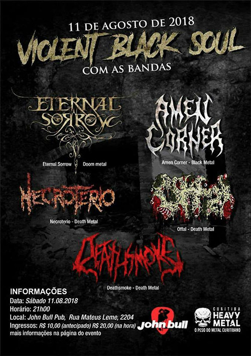O Violent Black Soul já deixa explícito em seu nome qual o estilo musical que predominará. O festival vai acontecer dia 11 de agosto, sábado, e reunirá no renovado palco do John Bull Pub cinco grupos de Metal, em suas vertentes mais agressivas.
