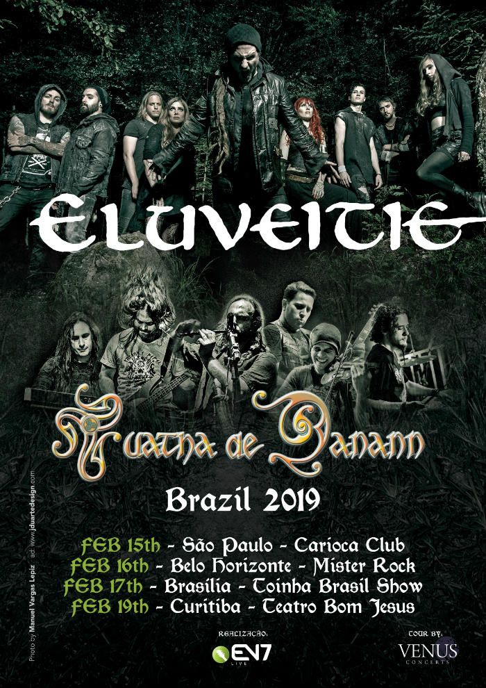 A mega-banda suiça Eluveitie retorna ao país para uma série de apresentações em fevereiro. Os shows acontecem em São Paulo, Belo Horizonte, Brasília e Curitiba. A conceituada banda mineira Tuatha de Danann será a convidada especial, tornando os shows imperdíveis para quem aprecia o chamado Folk Metal e similares.