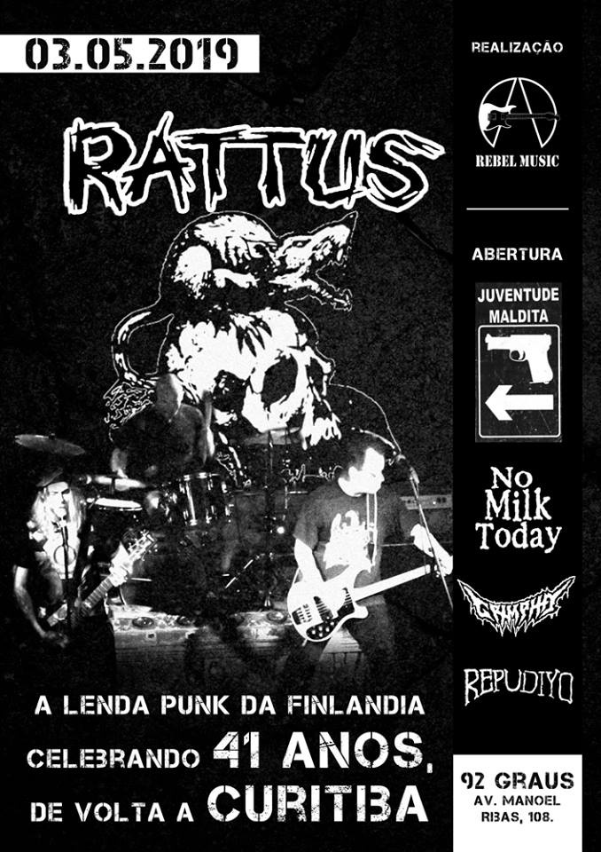 A finlandesa RATTUS é uma lenda na cena Punk mundial. O grupo foi formado em 1978, e nessas mais de 4 décadas, lançou diversos registros de estúdio, sendo alguns álbuns completos – mais um deve sair esse ano – e outros formatos diversos. E o trio virá ao Brasil novamente em 2019, pela terceira vez; vieram antes em 2007 e 2013.