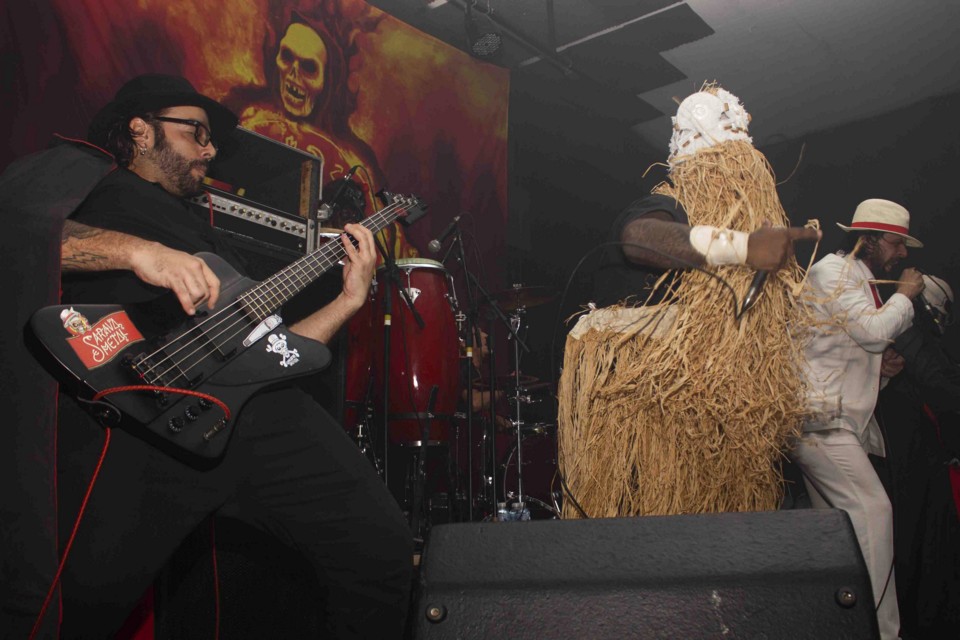 Por fim, o Gangrena Gasosa subiu ao palco, por volta da meia-noite. A excitação da platéia era alta e essa energia foi para o palco e voltou em forma de um show furioso. Gangrena Gasosa é sempre um show de alto nível, mas essa noite foi especial. Angelo Arede – Zé Pelintra (vocal), Eder Santana – Omulu (vocal), Minoru Murakami – Exu Caveira (guitarra), Diego Padilha – Tranca Rua das Almas (baixo), Gê Vasconcelos – Pombagira Maria Mulambo (percussão) e o mais recente membro Alex Porto – Exu Tiriri (bateria) estavam possuídos, e o repertório muito bem escolhido afinou ainda mais a fúria e diversão. Mesmo com uma música agressiva e rápida, o clima no bar era muito amigável. Todos bebendo, curtindo numa tranquilidade quase paradoxal quando se pensa no estilo musical apresentado no palco.