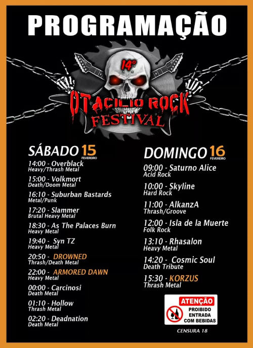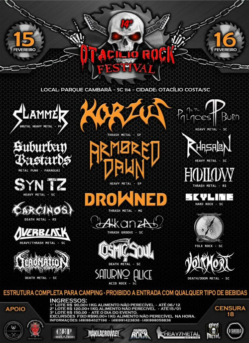 Confira as bandas que participarão: Korzus (SP), Armored Dawn (SP), Drowned (MG), Cosmic Soul (SC), Isla de la Muerte (SC), Deadnation DM (SC), Overblack (SC), Slammer (PR), Suburban Bastards (Paraguai), As The Palaces Burn (SC), Rhasalon (SC), AlkanzA (SC), Saturno Alice (SC), Volkmort (SC), Skyline (SC), Syn TZ (SC), Carcinosi (RS) e Hollow (SC).
