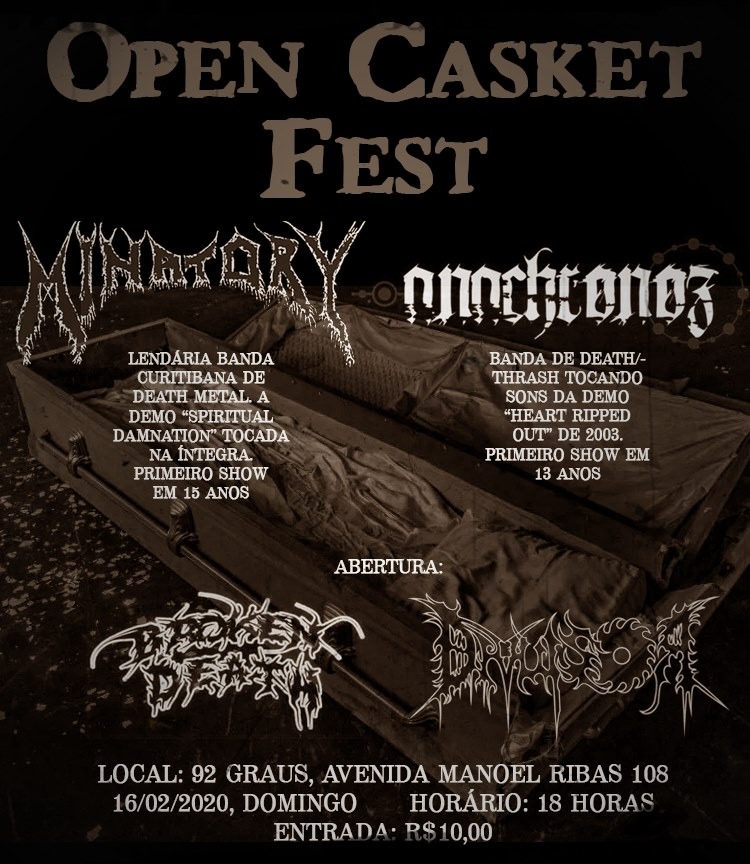 Vai rolar no domingo, 16 de fevereiro, o Open Casket Fest, que como o nome sugere, vai abrir o caixão para a ressurreição de duas bandas que marcaram época no começo do atual milênio: Minatory e Anachronoz voltam às atividades após muitos anos, para alegria da velha guarda do Metal curitibano. E as chances de ter ter outra oportunidade de vê-los é praticamente nula. Portanto, compareça!