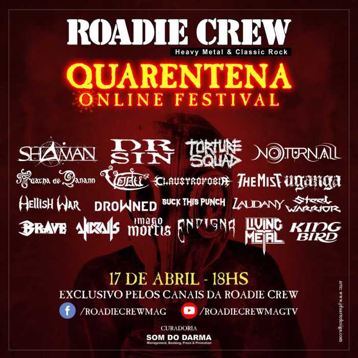 A revista Roadie Crew, em parceria com a produtora Som do Darma, apresenta nesta sexta-feira (17) a primeira edição do festival online “Roadie Crew – Quarentena Online Festival”, a partir das 18h. Outras edições devem ser anunciadas em breve.