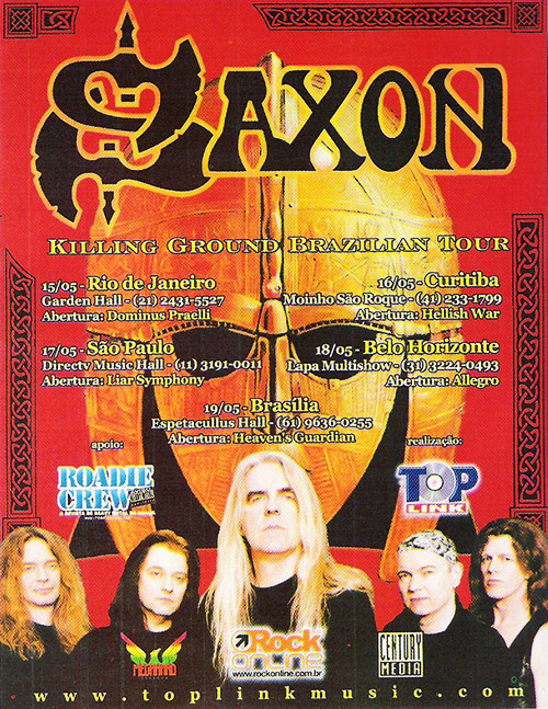O Saxon veio pela primeira vez ao Brasil em 1997, tocando em Santos e também no Palace, em São Paulo, em show que recebeu resenhas inflamadas da imprensa especializada da época (leia-se Rock Brigade). No ano seguinte teve repeteco no Monsters of Rock. Ambas foram dentro da turnê do furioso Unleash the Beast. A tour do Metalhead (1999) nem passou perto do nosso continente, mas esse erro foi corrigido com Killing Ground (2001), que trouxe a banda ao país para algumas datas marcadas por públicos moderados em quantidade, exceto, obviamente, em São Paulo. Vale frisar que o show do Rio de Janeiro, previamente anunciado, não aconteceu. Mesmo com disco novo debaixo dos braços, o grupo focou mesmo no seu repertório clássico, o que escreveu o nome do grupo na lista de shows mais memoráveis que a capital paranaense já recebeu.