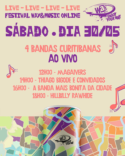 Já o trio curitibano de punkrock Magaivers comemora 19 anos de estrada em 2020. São sete discos de estúdio, dois discos gravados ao vivo, um DVD gravado na cidade de São Paulo e sete videoclipes. A banda já se apresentou em todas regiões do Brasil, além de levar seu som para cidades da Argentina e do Uruguai. Nos últimos meses, a banda aproveitou a quarentena prolongada para trabalhar em seu oitavo disco em estúdio. Completando a programação do Festival Way & Music, o cantor, compositor e instrumentista Tiago Bigode. O artista virou referência com sua sonoridade latina e uma das principais atrações do Brasil Summerfest, nos Estados Unidos, ao lado de artistas como Bebel Gilberto e Emicida. De volta ao Brasil, se radicou em Curitiba, onde está até hoje, e criou a banda Bigode Groove. Em seu trabalho solo, faz uma síntese de influências, com traços de Seu Jorge, 5 a seco, Jorge Ben, Ivan Lins e Milton Nascimento.