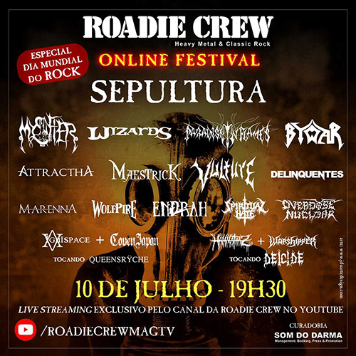 A revista Roadie Crew, em parceria com a produtora Som do Darma, apresentam nesta sexta-feira, dia 10 de Julho, a quarta edição do festival online Roadie Crew – Online Festival, agora em novo horário: às 19h30.