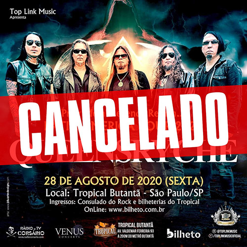 Devido a pandemia, as produtoras Top Link Music, Rádio & TV Corsário e Venus Concerts informam que está oficialmente cancelada a apresentação da banda norte-americana Queensrÿche em São Paulo. O show aconteceria no próximo dia 28 de agosto, na Tropical Butantã.