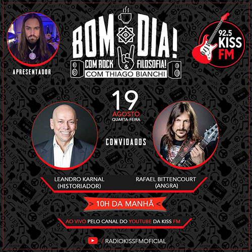 O próximo programa do respeitado talk show Bom dia! Com Rock e Filosofia! será muito especial. No dia 19 de agosto, às 10h, no YouTube da rádio Kiss FM, o apresentador Thiago Bianchi (Noturnall/ex-Shaman) convida o historiador Leandro Karnal e o guitarrista Rafael Bittencourt (Angra).