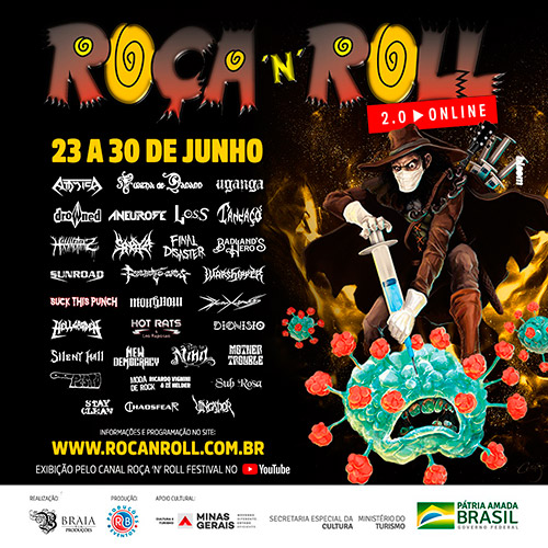 O “Roça ‘N’ Roll 2.0” será realizado durante oito dias, de 23 a 30 de Junho, e vai reunir 31 bandas de diversos estilos de rock e metal. Os shows serão transmitidos, gratuitamente, a partir das 20h pelo canal oficial do Roça ‘n’ Roll no Youtube: https://www.youtube.com/rocanrollfestival. Entre as bandas participantes, estão Uganga, Warshipper, Sunroad, Hammathaz, Suck This Punch e Psychotic Eyes.