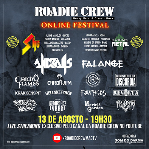 A transmissão do festival – realização da revista Roadie Crew, com curadoria do Som do Darma – acontece no canal do YouTube da Roadie Crew, na sexta-feira, dia 13 de agosto, às 19h30: https://www.youtube.com/roadiecrewmagtv