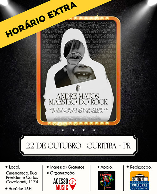 Devido a grande procura dos fãs, o documentário Andre Matos – Maestro do Rock terá sessão extra em Curitiba, no dia 22 de outubro, sexta-feira, às 16h, na Cinemateca. A sessão das 19h está completamente esgotada.