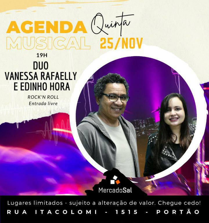 O duo Vanessa Rafaelly e Edinho Hora é a atração de quinta-feira (25) do Mercado Sal (Rua Itacolomi, 1515 – Portão). O repertório da dupla é calcado nos clássicos do Rock And Roll, e a entrada é gratuita. A apresentação começa às 19h.