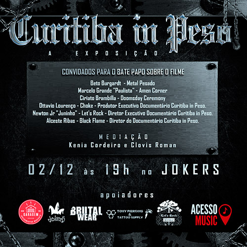 O Jokers, renomado espaço cultural de Curitiba, recebe em 02 de dezembro às 19h, a abertura do Curitiba in Peso, documentário sobre o cenário da música pesada na cidade. Com entrada gratuita, o evento inaugura uma exposição fotográfica com momentos marcantes do Metal em Curitiba, e terá um debate com alguns de tantos personagens importantes do underground curitibano. A exposição contará com 40 imagens, sendo elas fotos e cartazes de shows que marcaram época.