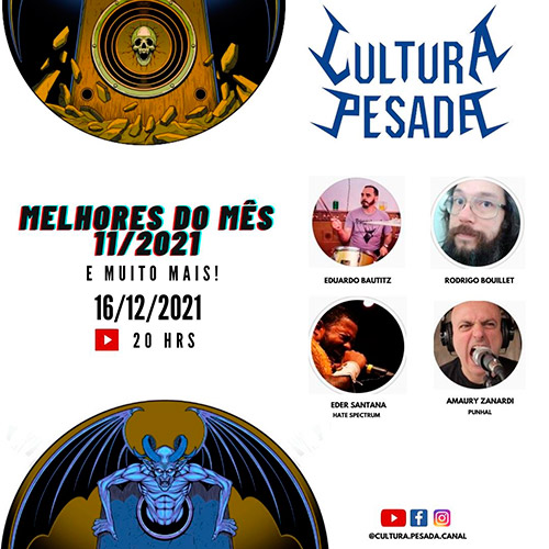 O canal Cultura Pesada recebe o vocalista Eder Santana, da Hate Spectrum, e Amaury Garcia (Punhal) para comentar cinco lançamentos selecionados de novembro: Adliga (Bielorrúsia), Aztlan (México), Converge (EUA), Glassing (EUA) e Sangue de Bode (Brasil). O vídeo vai ao ar dia 16 de dezembro, às 20h.