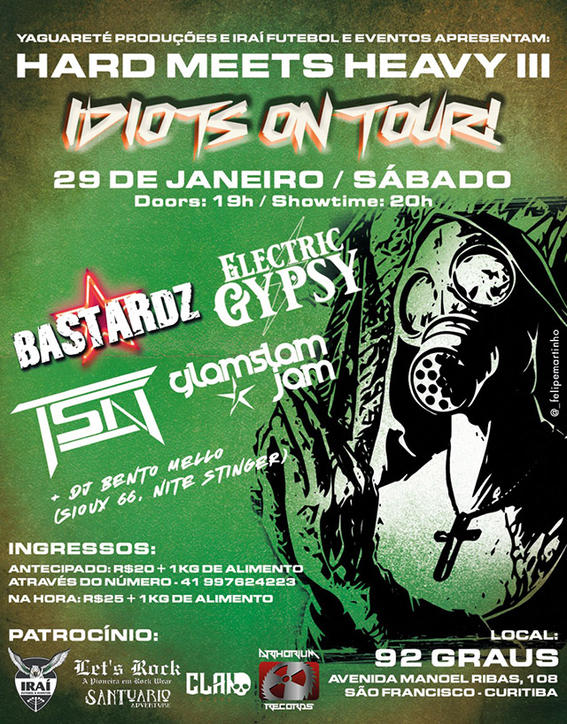 Acontece no dia 29 de janeiro, sábado, no 92 Graus o Hard Meets Heavy III – Idiots on Tour, que trará a Curitiba dois grandes nomes do hard rock brasileiro: a revelação Electric Gypsy (Minas Gerais) e a lendária banda paulista Bastardz, que fará nos palcos curitibanos o último show de sua história.