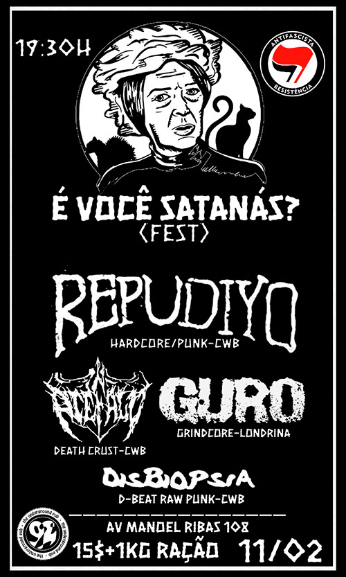 Apenas bandas das vertentes mais desgraçadas da música pesada estarão presentes no genialmente intitulado É Você Satanás? Fest, cujo nome, obviamente, é uma homenagem ao cãozinho da Bruxa do 71. Três bandas locais estarão presentes: Repudiyo, Acéfalo e Disbiopsia, além do Guro, bandaça de grind de Londrina.