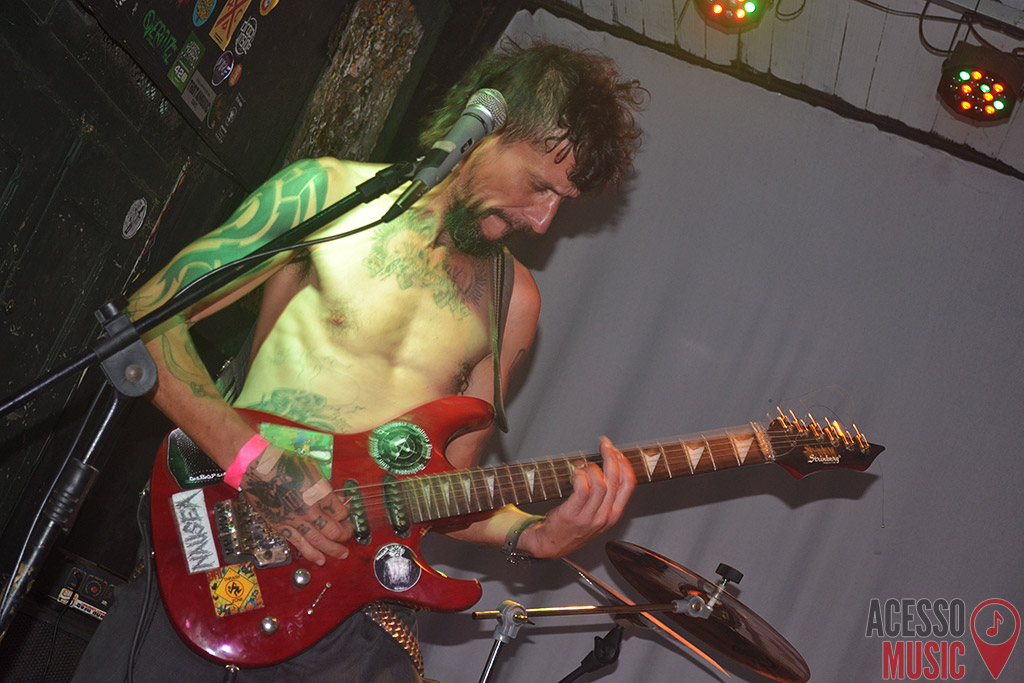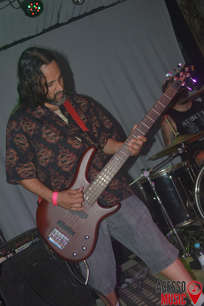 De acordo com o cartaz, imaginei que o Disbiopsia abriria, mas quem subiu no palco primeiro foi o Acéfalo, por volta das 21h, mandando um death metal com referências generosas de crust e grind, resultando em músicas violentas e com letras de protesto e críticas sociais (o título de “Gädo”, por exemplo, deixa este fator bem claro). O registro da banda é o EP Macäbro – composto em sua totalidade por Jhonny Benson –, tocado em uma apresentação curta, com cerca de 25 minutos. A formação para esta noite foi enxuta, pois Benson (guitarra e voz) teve ao seu lado apenas o baterista Sidnei “CJ” Dubiella, músico gabaritado da cena local, que toca no Thou Shall Not e Hell Gun, entre outras, eventualmente.