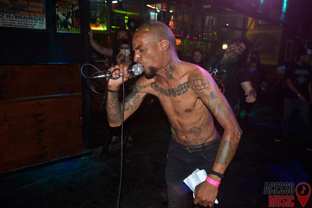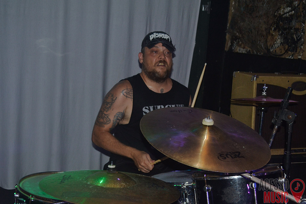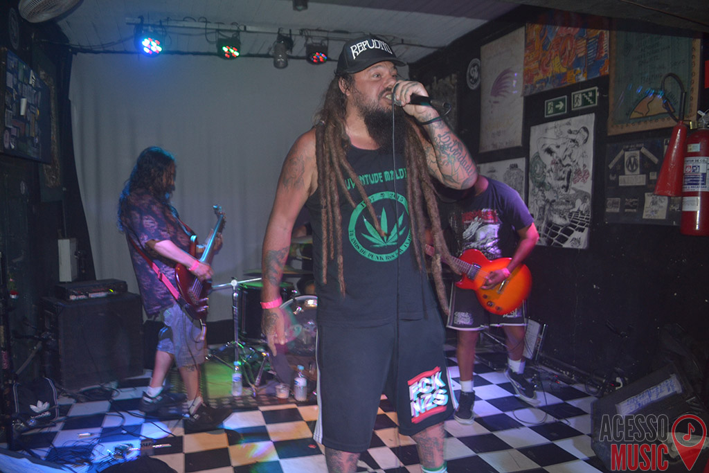 Com a mistura de públicos, que englobava headbangers e punks, o movimento na parte externa do 92 Graus era intensa. Entretanto, a parte Metal dos presentes foi a que, primordialmente, entrou de fato na casa para conferir as bandas. A maioria ficou lá fora, apenas na algazarra. Algo que aconteceu não apenas na primeira banda, mas durante toda a noite. Poucos viram o Disbiopsia, banda que se classifica como D-Beat Raw Punk, ou seja, Punk. O show foi enérgico, inclusive com o vocalista descendo algumas vezes do palco para gritar no meio da galera, que proporcionou alguns moshes e rodinhas. No finalzinho, o vocalista saiu do palco e era visto fora do bar conversando, enquanto os músicos tocavam os últimos acordes.