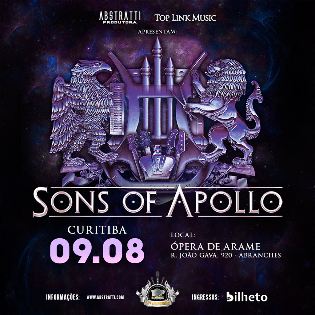 Entre as apresentações confirmadas para o país está uma inédita em Curitiba, cidade que recebe o Sons of Apollo no dia 09 de agosto (terça-feira), no palco da Opera de Arame (Rua João Gava, 920 – Abranches). Os ingressos estão à venda online pela plataforma Bilheto (com possibilidade de parcelamento em até 12x) e nos pontos físicos de venda, por valores a partir de R$ 110.