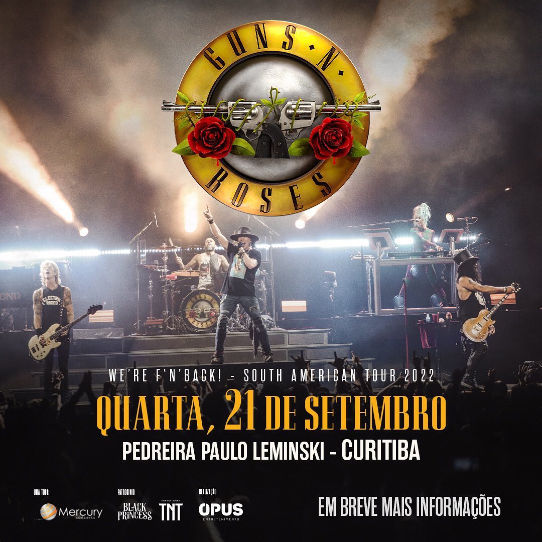 A banda norte-americana Guns n’ Roses confirmou recentemente a passagem da “Guns N’ Roses Are F’ N’ Back!” por diversas capitais do Brasil. Em parceria com a Mercury Concerts, a Opus Entretenimento, uma das produtoras que mais crescem na América Latina, abriu a venda de ingressos para os shows em Florianópolis (18/09 – Hard Rock Live Open Air), Curitiba (21/09 – Pedreira Paulo Leminski) e Porto Alegre (26/09 – Arena do Grêmio) pelo site https://gunsnroses.uhuu.com e pontos autorizados.