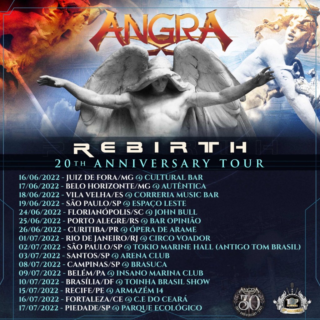 O Angra acaba de confirmar as 16 datas da turnê de celebração a “Rebirth”, como o grupo havia se proposto a fazer em um mês. A turnê passará por todo o Brasil, mas, em função da grande demanda de shows e devido aos compromissos de Bruno Valverde, que estará excursionando com o Smith-Kotzen, da qual ele também é integrante, não foi possível o agendamento de mais shows.