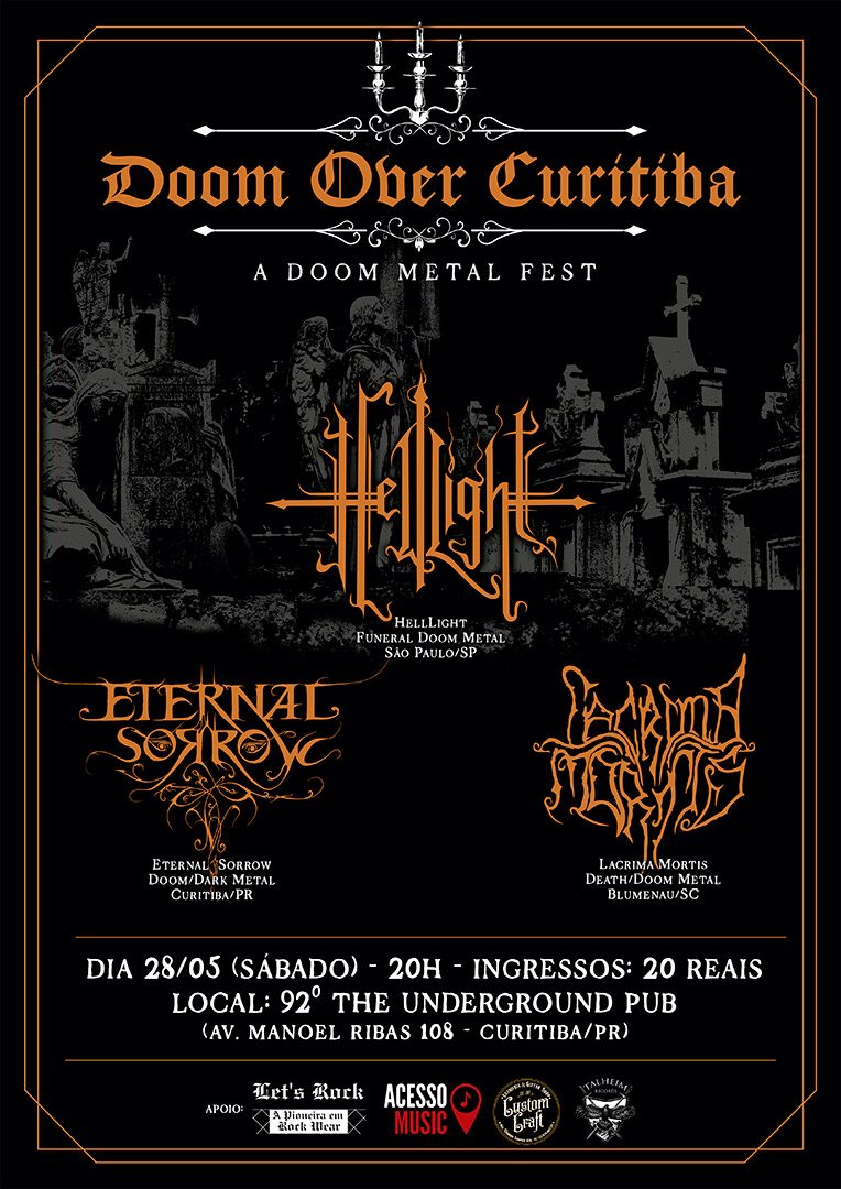 Dia 28 de maio Curitiba volta a receber um evento para celebrar a forma mais lúgubre de se fazer Metal. Trata-se do Doom Over Curitiba, que reunirá três bandas no 92 Graus. De Curitiba, a lendária Eternal Sorrow volta aos palcos após quase quatro anos. O grupo, formado em meados dos anos 1990, conta com três discos importantes do estilo na discografia, e deve apresentar músicas de todas as fases.