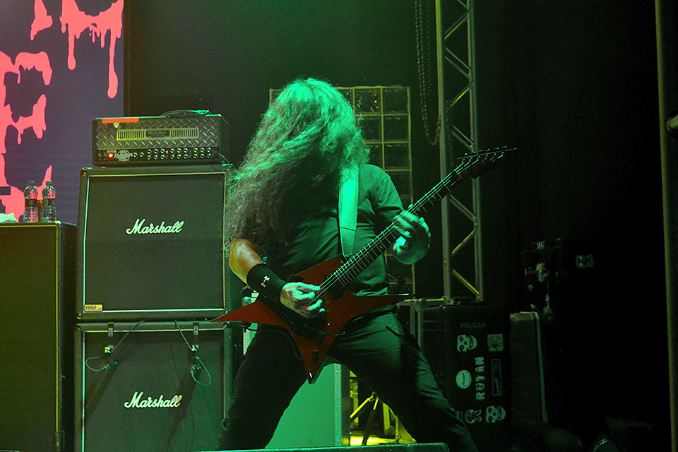 A abertura veio com uma porção de faixas lançadas na última década e meia. Primeiro a veloz “The Time to Kill is Now” (Kill, 2006), depois a cadenciada e brutalmente pesada “Scourge of Iron” (Torture, 2012) , a nova “Inhumane Harvest” (com uma aura fantástica do The Bleeding em certas passagens) e “Code of the Slashers” (Red Before Black, 2017). O bloco seguinte trouxe três clássicos: “Fucked With a Knife”, “The Wretched Spawn” e “Gutted”, que aumentaram ainda mais a violência das rodinhas no público próximo a grade. Quem queria ver o show um pouco mais tranquilo, optou pelas laterais ou ficar mais ao fundo. Como o Tork N Roll é uma casa espaçosa, todo mundo conseguiu se posicionar da maneira que preferia.