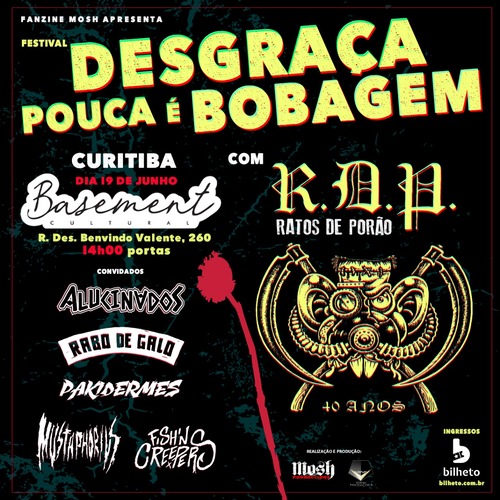 Com quatro décadas de estrada e uma carreira alicerçada não apenas no Brasil, mas também no exterior, o Ratos de Porão é uma das bandas mais importantes da música em nosso país. O expoente do punk/hardcore, que recém-lançou o álbum Necropolítica, chega no dia 19 de junho (domingo) a Curitiba para mais uma performance devastadora. O novo local do show é o Basement Cultural.