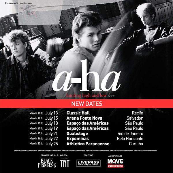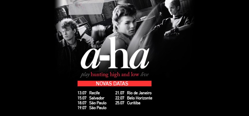A turnê mundial para celebrar o aniversário de 35 anos do álbum de estreia do A-Ha, Hunting High And Low, lançado em 1985, chega finalmente ao Brasil em julho. Além de Curitiba, que estava com os ingressos esgotados e ganha hoje (08) uma nova carga de entradas, a banda passará ainda por Recife (13/07), Salvador (18/07), São Paulo (18 e 19/07), Rio de Janeiro (21/07) e Belo Horizonte (22/07).