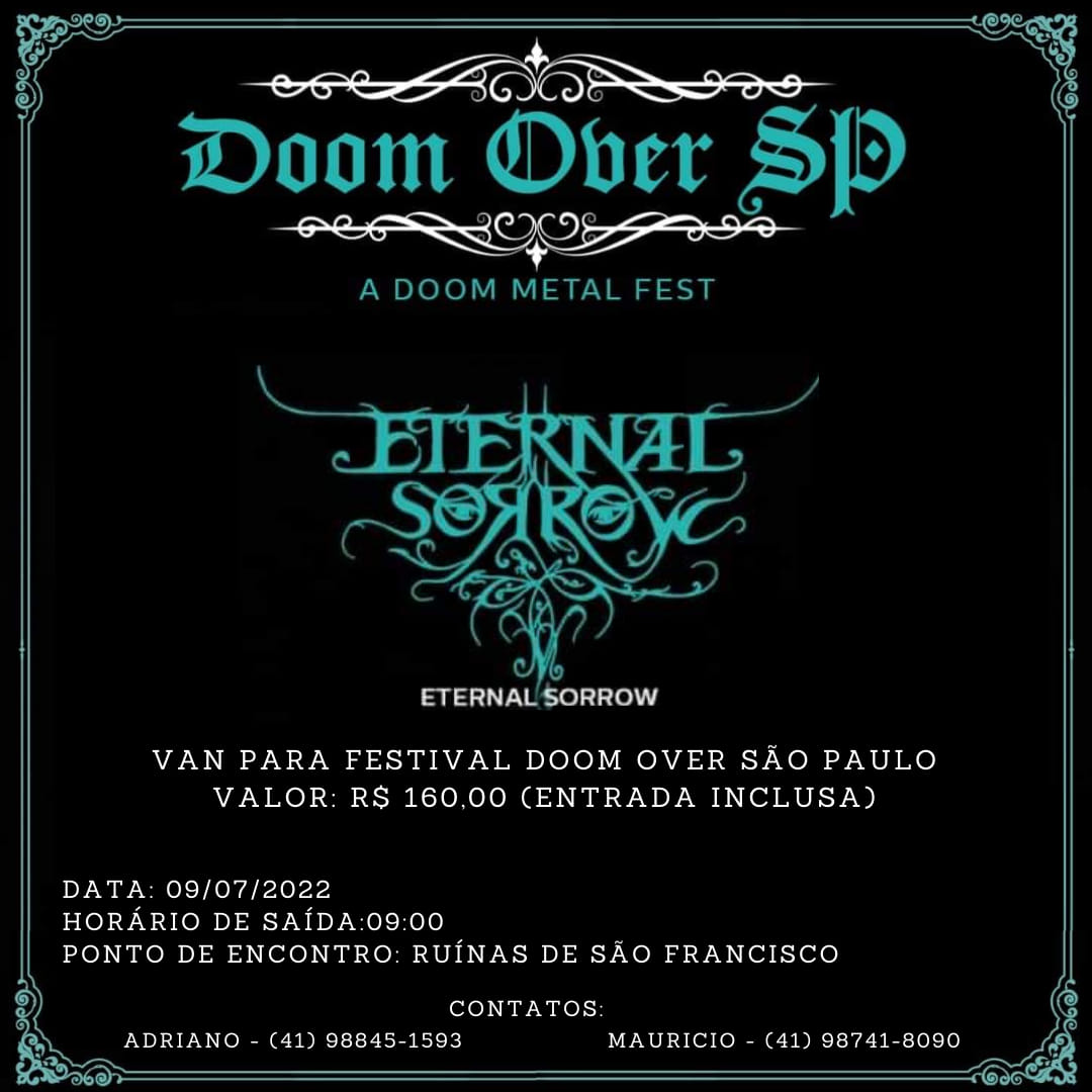 Dia 09 de julho, o Eternal Sorrow, um dos maiores nomes do Doom Metal nacional, se apresenta novamente em São Paulo, desta vez no Doom Over SP, que será realizado no Espaço Som (Rua Teodoro Sampaio, 512). Além da banda curitibana, participam Helllight e Unholy Outlaw). 28 de maio Curitiba volta a receber um evento para celebrar a forma mais lúgubre de se fazer Metal.