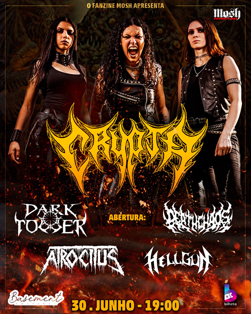 Uma das novas sensações do Metal brasileiro, o Crypta, chega pela primeira vez a Curitiba no dia 30 de junho, para uma apresentação no Basement Cultural. Para a abertura, o conceituado grupo de death/black metal Dark Tower, do Rio de Janeiro, e as bandas locais Death Chaos, Hell Gun e Atrocitus. Os ingressos estão à venda pela Bilheto, com valores a partir de R$ 70.
