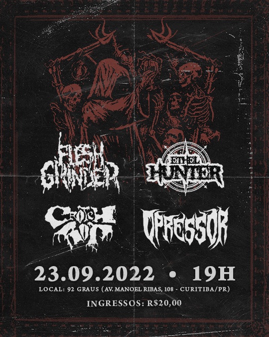 Figurinha carimbada nos palcos curitibanos tempos atrás, o Flesh Grinder está há um punhado de anos sem visitar a capital paranaense. A espera terá seu fim em 23 de setembro, sexta-feira, no 92 Graus. O rolê começa às 21 horas, e contará com três bandas da cidade na abertura: Opressor, Ethel Hunter e Crotch Rot.