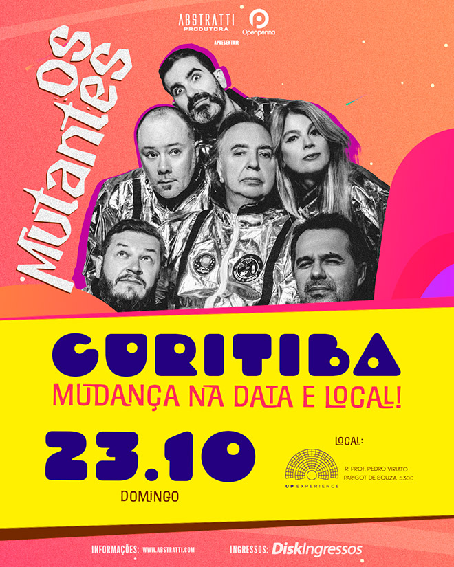 A apresentação da lendária banda Os Mutantes em Curitiba tem nova data. O show agora acontece no dia 23 de outubro, agora no Teatro Up Experience (também no Campus da Universidade Positivo). Para mais informações sobre os ingressos, o consumidor deve contatar a equipe do Disk Ingressos. O grupo e a produção agradecem a compreensão dos fãs referente a esta mudança.