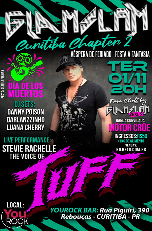 A festa Glam Slam Curitiba Chapter II trará a Curitiba a voz da banda de hard rock americana Tuff, Stevie Rachelle. O evento acontece no dia 01 de novembro, terça-feira (véspera de feriado), no YouRock. A banda que acompanhará o artista para este show contará com o baixista Bento Mello e o baterista Gabriel Haddad (ambos do Sioux 66), além do guitarrista Leo Gon .