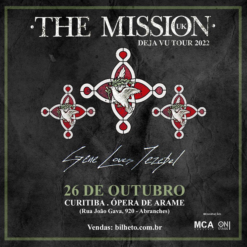 A banda britânica de gothic rock The Mission, formada em 1986, se apresenta ao lado dos também ingleses do Gene Loves Jezebel na Ópera de Arame, em Curitiba, no dia 26 de outubro. O show rolaria no dia 25, mas foi remarcado devido ao show do Imagine Dragons na Pedreira Paulo Leminski. Os ingressos custam a partir de R$ 130, podem ser adquiridos no Bilheto.