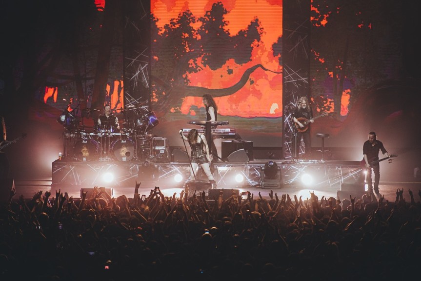 Do clássico Once, veio “Planet Hell”, com Floor fazendo as partes do baixista Marco Hietala, que deixou o grupo após quase duas décadas. A perda do músico (substituído pelo discreto Jukka Koskinen, ex-Wintersun) foi um duro golpe, todavia, como o Nightwish é craque em se reinventar, tudo foi adaptado e o show continuou. Outra mudança na interpretação veio em “I Want My Tears Back”, com o coringa multi-instrumentista Troy Donockley fazendo as partes vocais do ex-baixista. Nesta, todos os instrumentistas ficaram no praticável ao fundo, passando ao público uma sensação de união e camaradagem entre eles. Por sua vez, Floor, posicionada no centro do palco, à frente, catalisou as atenções para si, e não apenas neste momento, mas durante todo o repertório.