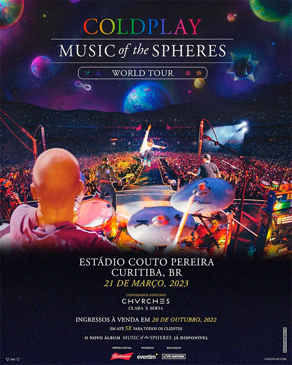 O Coldplay vai trazer Music Of The Spheres Tour para Curitiba no dia 21 de março de 2023 (terça-feira), em apresentação que acontece no Estádio Couto Pereira. O local (que nos últimos anos recebeu Paul McCartney, Maroon 5, Roger Waters e Metallica) tem capacidade para aproximadamente 43 mil pessoas quando utilizado como espaço para shows.