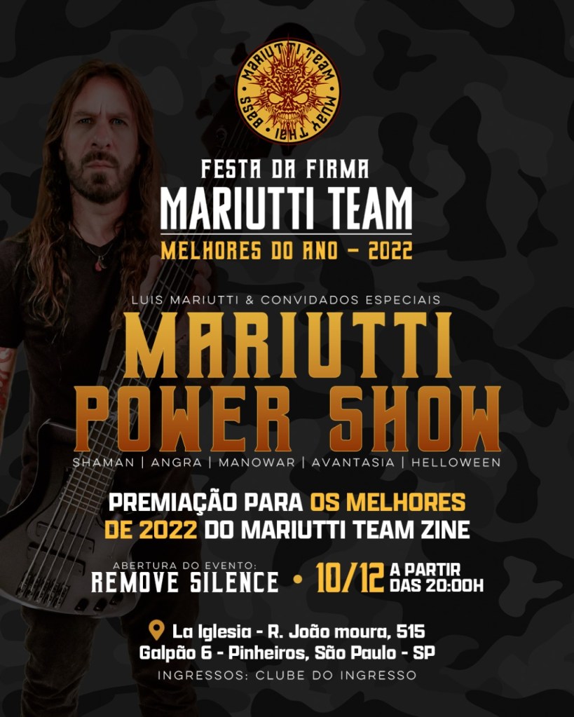 O baixista Luis Mariutti acaba de anunciar sua festa anual que reúne o Mariutti Team e celebra as conquistas do ano com muita música e artistas da cena Metal Nacional. Este ano o Mariutti Team premia os melhores do ano, entre as bandas que estiveram presente nas edições do Mariutti Team Zine de 2022.