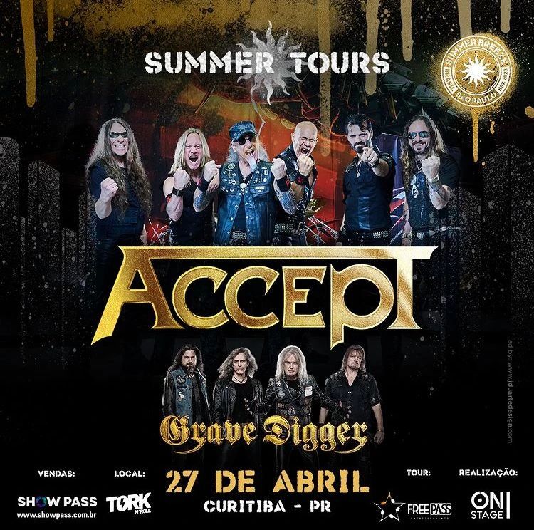 Duas grandes atrações do festival Summer Breeze Brasil, que acontece nos dias 29 e 30 de abril, em São Paulo, virão juntas a Curitiba. Os titãs meálicos da alemanha, Grave Digger e Accept, tocam no Tork N’ Roll, dia 27 de abril (quinta-feira). Os ingressos estarão à venda pelo site Show Pass a partir do dia 06/12.