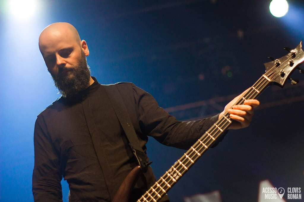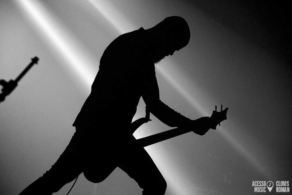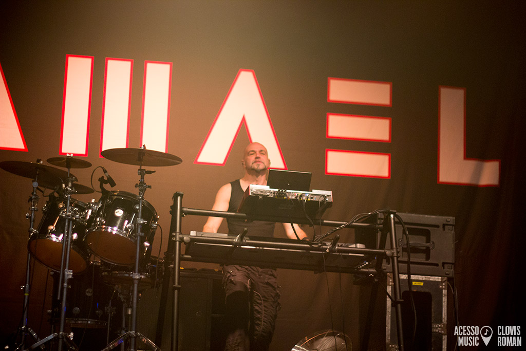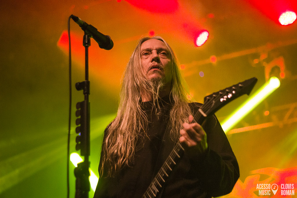 Formado no final dos anos 1980, na Suiça, o Samael veio pela segunda vez ao Brasil. Liderado por Vorph (guitarra e voz) e seu irmão Xy (percussão e teclados), atualmente conta também com o baixista Ales Campanelli e o insano guitarrista Drop, que roubou a cena com sua presença de palco agitada. Apesar de terem iniciado com o rótulo do black metal, o grupo evoluiu para uma sonoridade mais industrial, criando algo único. Dessa forma, o setlist desta noite foi dividido em duas partes. A segunda, com músicas de todas as fases, e a primeira, com o clássico álbum Passage na íntegra. Assim, a enigmática “Rain” abriu a noite com força, apesar do som, que levou um tempo até acertar alguns detalhes. Partes climáticas e outras mais ásperas marcaram a canção, seguida por “Shining Kingdom”, mais melódica e depois, “Angel’s Decay”. O frontman Vorph cantou músicas como “The Ones Who Came Before” e “Moonskin” sem a guitarra, em uma postura que amplificou a teatralidade da apresentação. A comunicação com o público foi esparsa, porém, simpática. “Obrigado. A próxima canção é um pouco mais épica”, disse, em português mesmo, antes de anunciar “Born Under Saturn”.