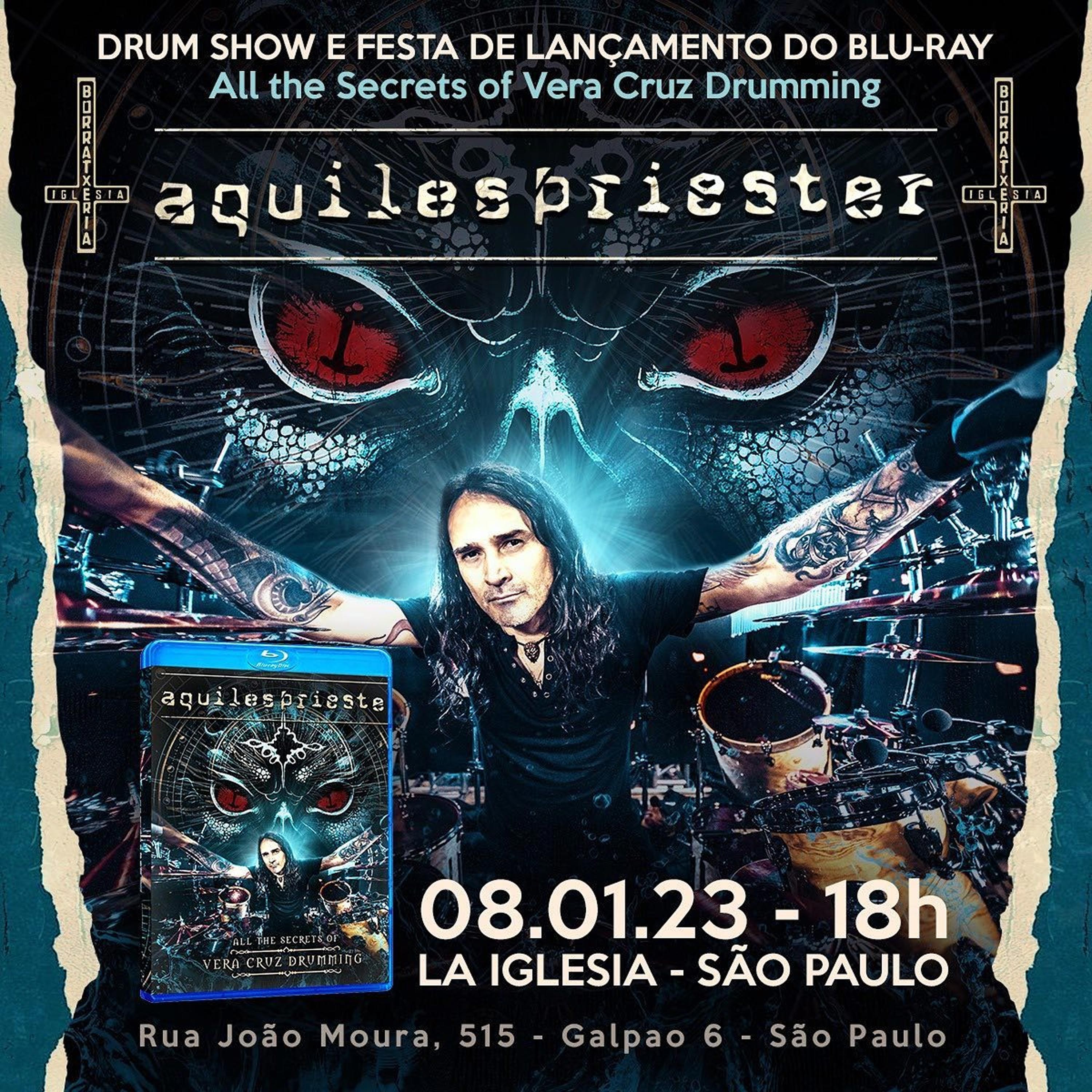 O baterista Aquiles Priester (W.A.S.P., Edu Falaschi, Hangar) lança nos formatos físico e online o Blu-Ray duplo “All The Secrets of Vera Cruz Drumming” com todas as músicas do álbum “Vera Cruz”, de Edu Falaschi, além de algumas músicas extras que não estavam registradas em vídeo pelo baterista. São seis horas de material inédito e com uma aula definitiva sobre dois bumbos, idealizada por Aquiles Priester, considerado pela crítica como um dos melhores bateristas do gênero.