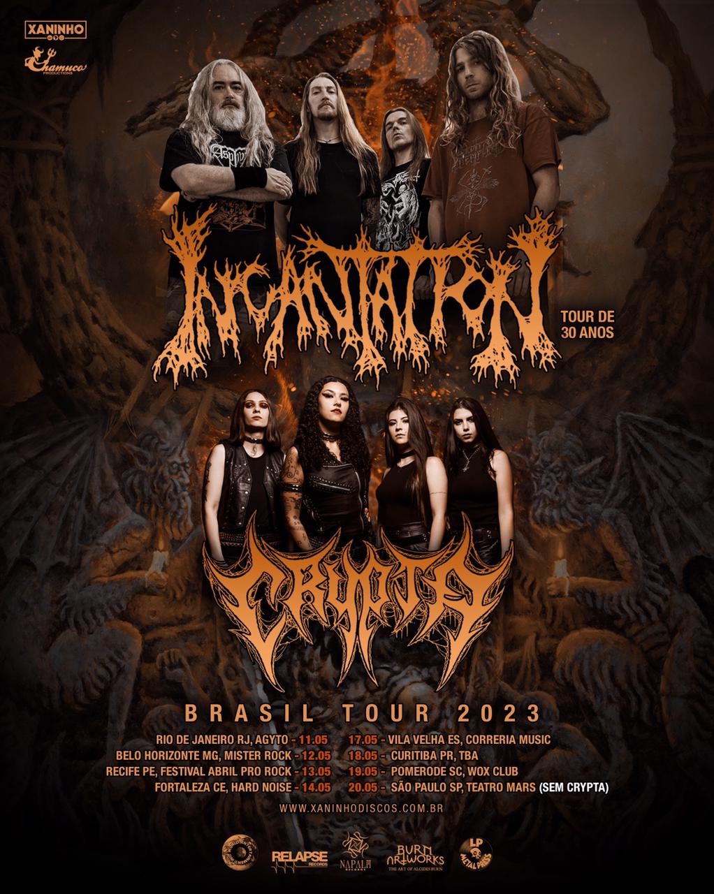 Em maio, a lenda do death metal norte-americano, o Incantation, celebra trinta anos de estrada com uma turnê especial pelo Brasil – organizada pela renomada Xaninho – contando com oito datas. Em sete delas, a Crypta será co-headliner. O Incantation retorna ao país menos de um ano após a última visita. No começo de setembro, eles tocaram em Curitiba ao lado do Suffocation, e claro que o Acesso Music esteve lá, relembre aqui.